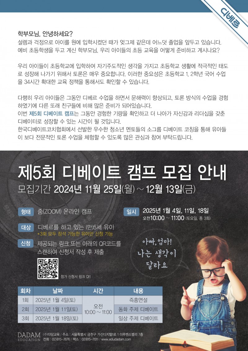 2025년 1월 4일부터 3주간 제5회 디베이트 캠프가 진행됩니다.