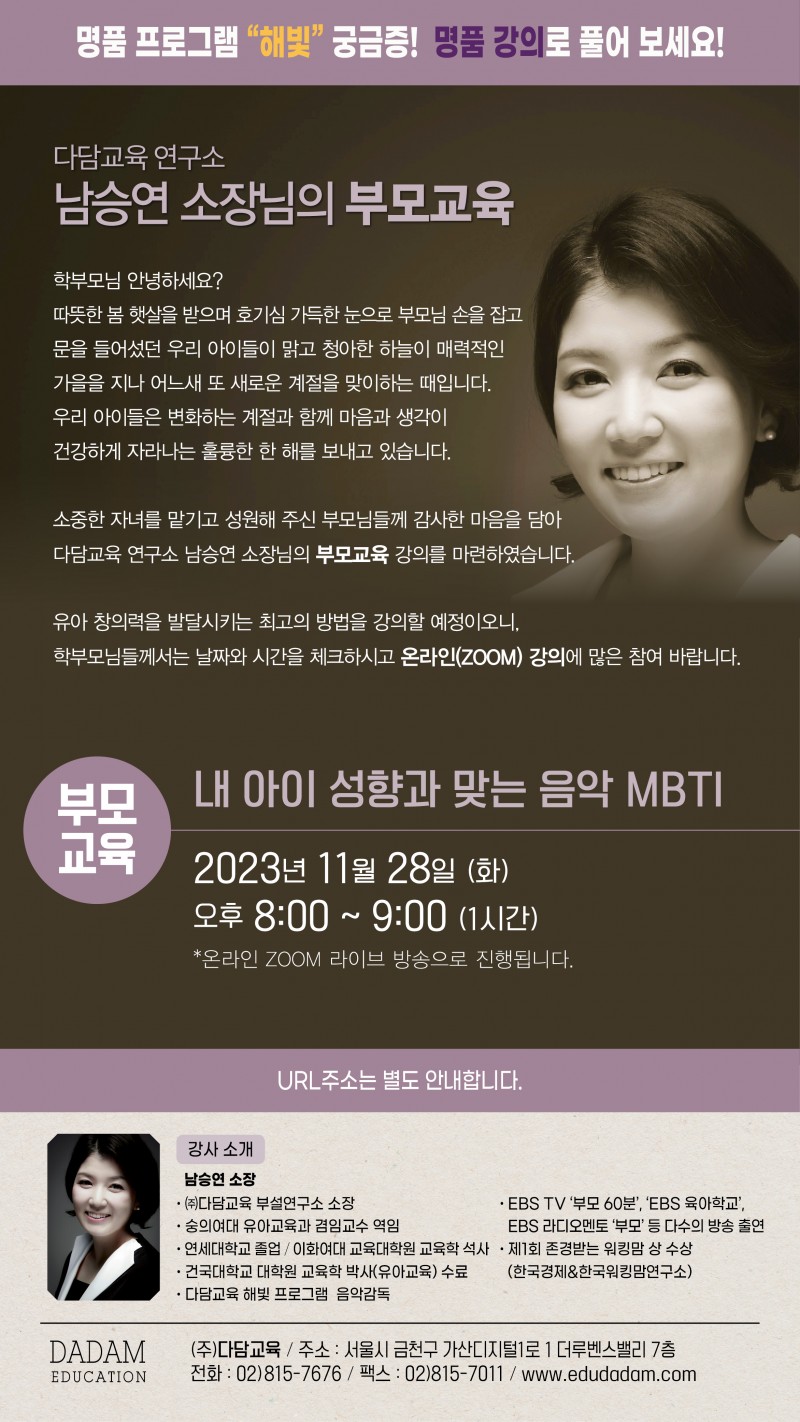 다담교육 연구소 남승연 소장님의 명품 강의, 2023 해빛 부모 교육이 온라인(ZOOM) 강의로 진행 될 예정입니다.