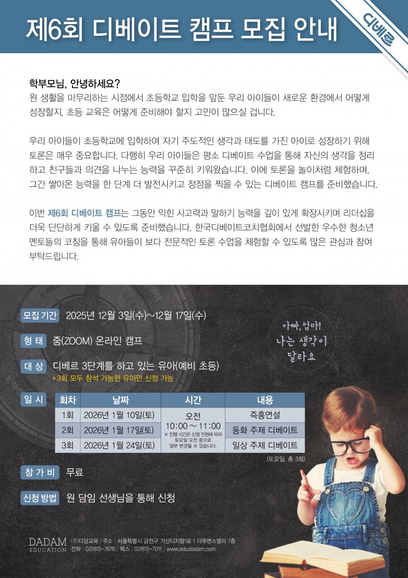 제6회 디베이트 캠프가 2026년 1월 10일부터 3주간 진행됩니다.