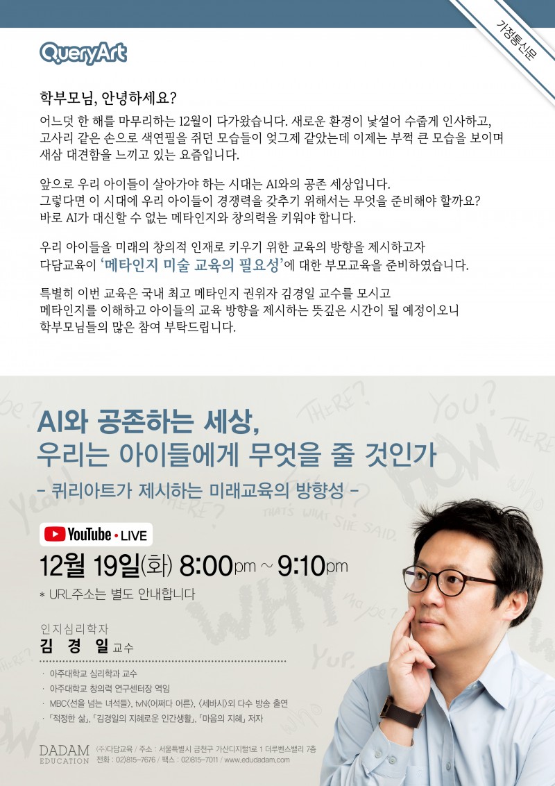 다담교육이 '메타인지 미술 교육의 필요성' 에 대한 부모교육을 준비하였습니다.