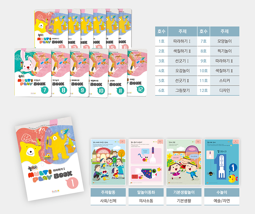 호별로 ‘따라하기북, 색칠북, 스티커북’ 등 활동이 명확한 워크북으로 고퀄리티의 다양한 활동을 경험하게 하고, 표준보육과정과도 연계하여 6개의 영역을 골고루 배우도록 체계화하였습니다.