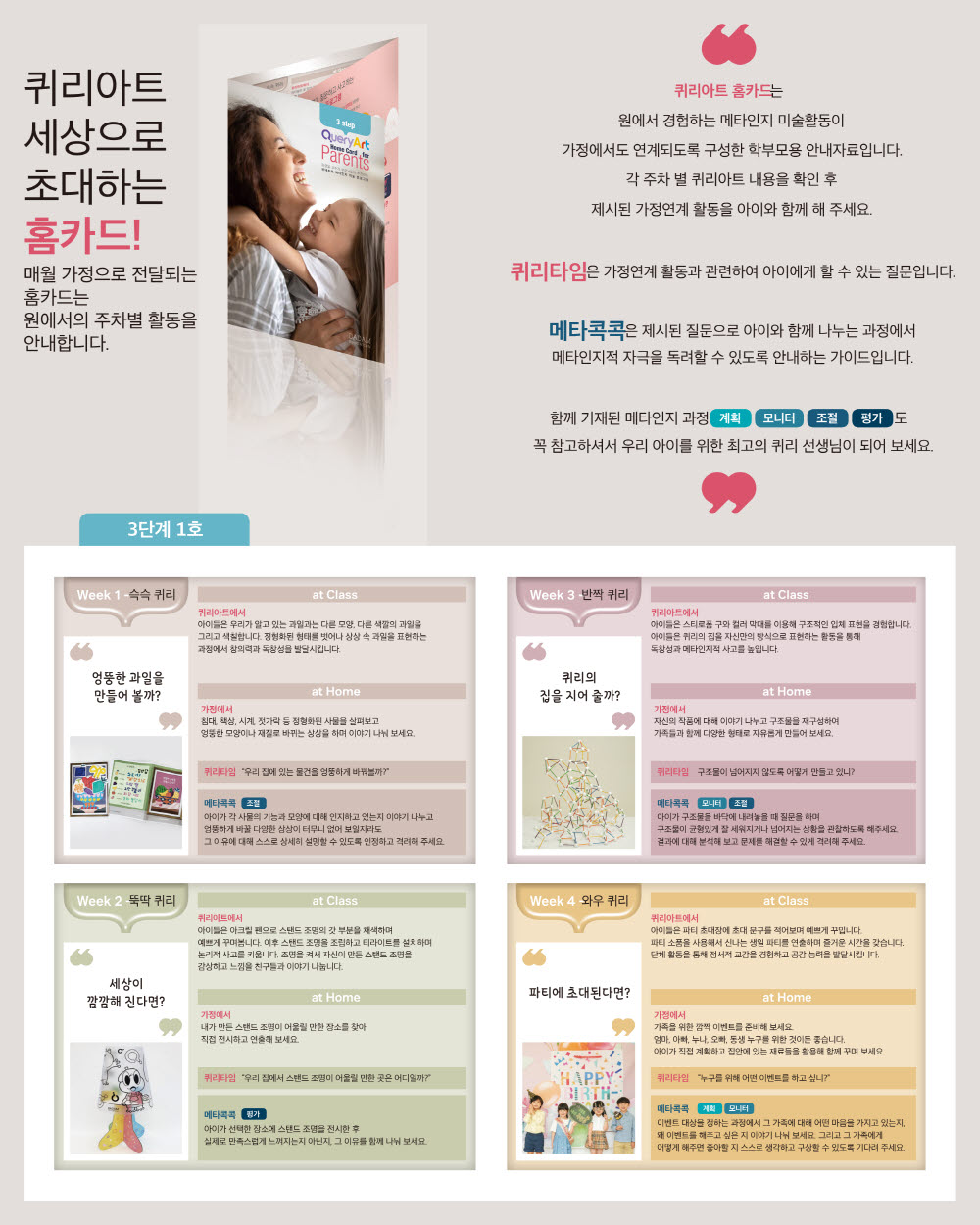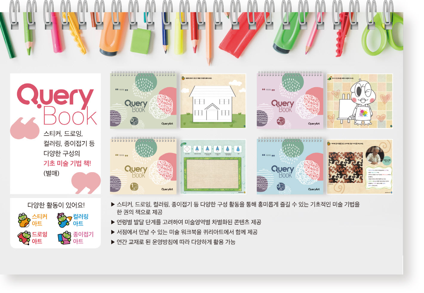 퀴리북은 유아들의 미적 감수성을 키우고 일상 생활에서 아름다움을 발견할 수 있도록 고안된 미술 워크북입니다.